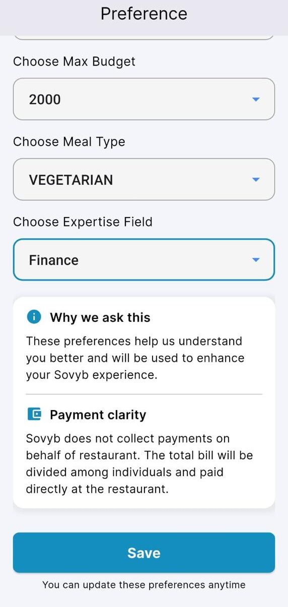 Sovyb is a premium curated social dining platform that helps you meet like-minded people over a great dinner experience. Instead of attending large events or random meetups, Sovyb brings together a small group of people who are matched based on shared interests and preferences.